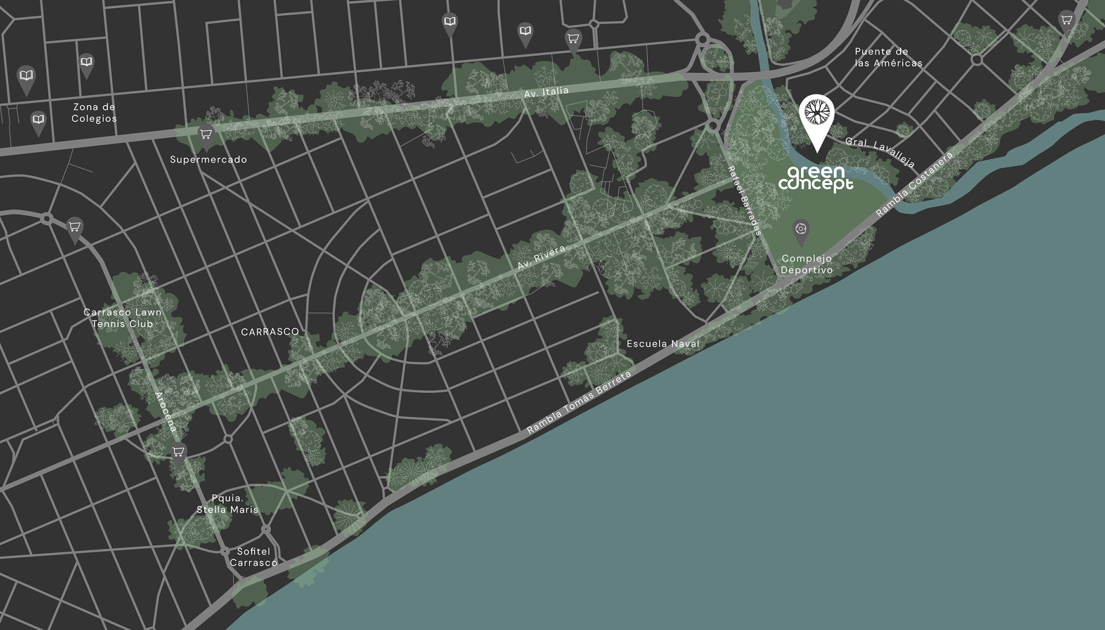 Green Concept se encuentra a metros de la rambla de Carrasco, en una excepcional ubicación desde donde se accede a los principales puntos de interés en un radio de 10 cuadras.
